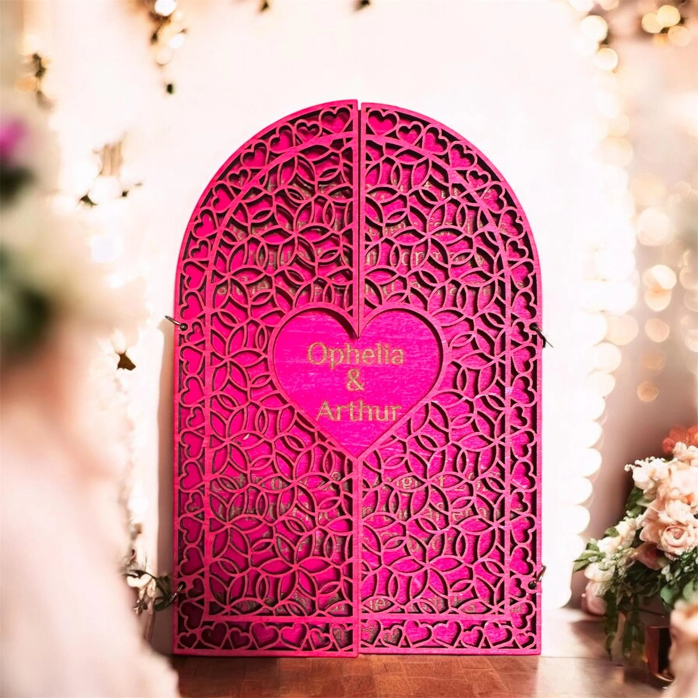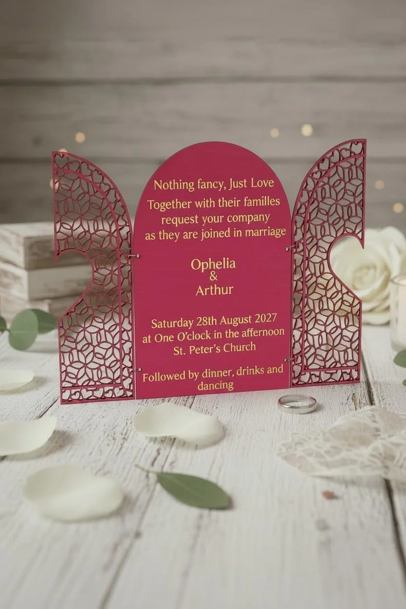 Make a bold first impression with this hinged wedding invitation, featuring a laser cut arch design and engraved personalization. This modern statement making invite opens to reveal your wedding details.