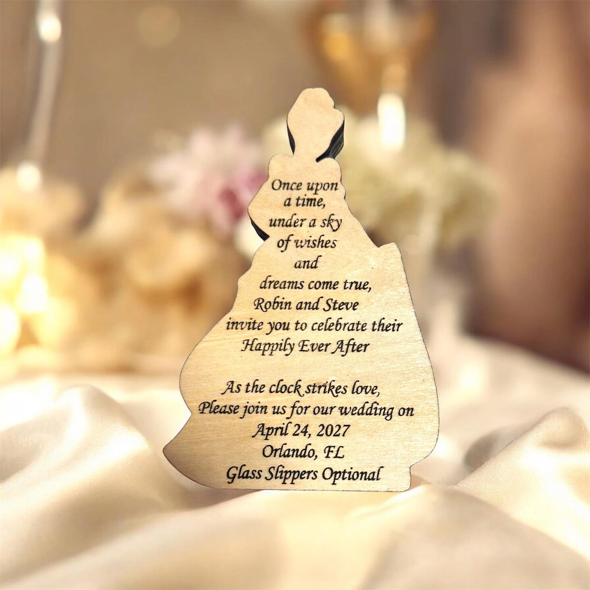 Celebrate Princess style with this storybook themed wood invitation. Layered to bring the story to life. This is a perfect invitation for your inner princess or prince who love a fairytale romance.