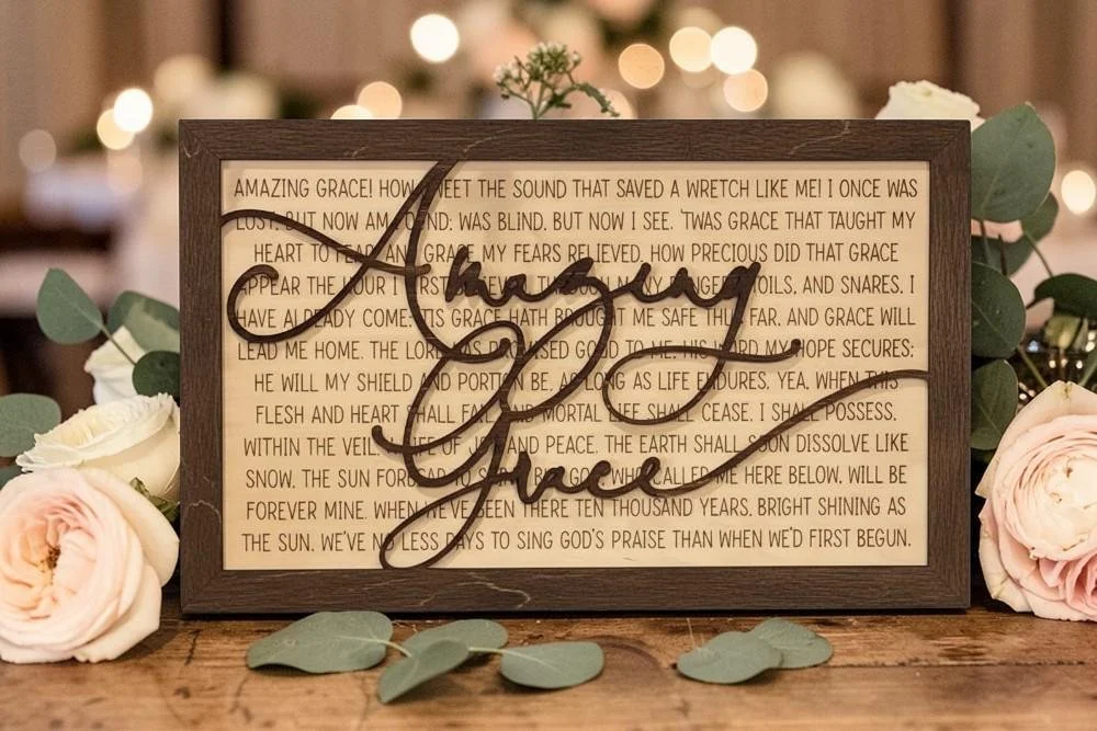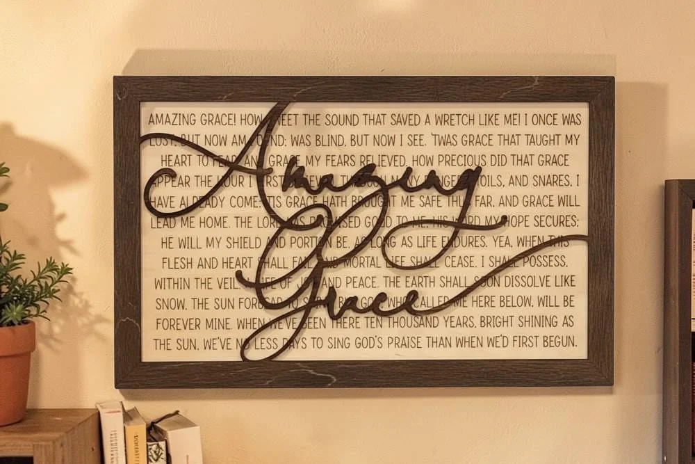 Bring timeless faith and inspiration into your home with this beautiful Amazing Grace hymn wall sign. Featuring the full lyrics of the beloved hymn engraved into wood with elegant script overlay, this piece creates a meaningful focal point in any space. This sign makes a thoughtful gift for housewarmings, weddings, baptisms, pastors or anyone who loves meaningful gifts. Perfect for: Living rooms Entry ways Prayer rooms Church decor Christian gifts Each piece is handmade so slight variations in the wood grain makes every sign unique.
