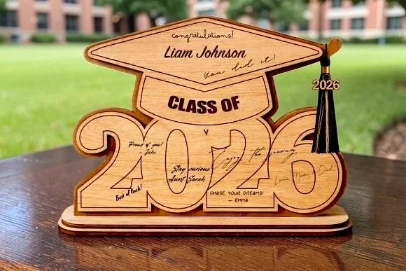 Celebrate your graduate in a meaningful way with this Class of 2026 wooden signature keepsake. Designed in the shape of a graduation cap and bold 2026 numbers this piece allows friends and family to leave handwritten messages directly on the wood, creating a lasting memory your graduate will treasure.