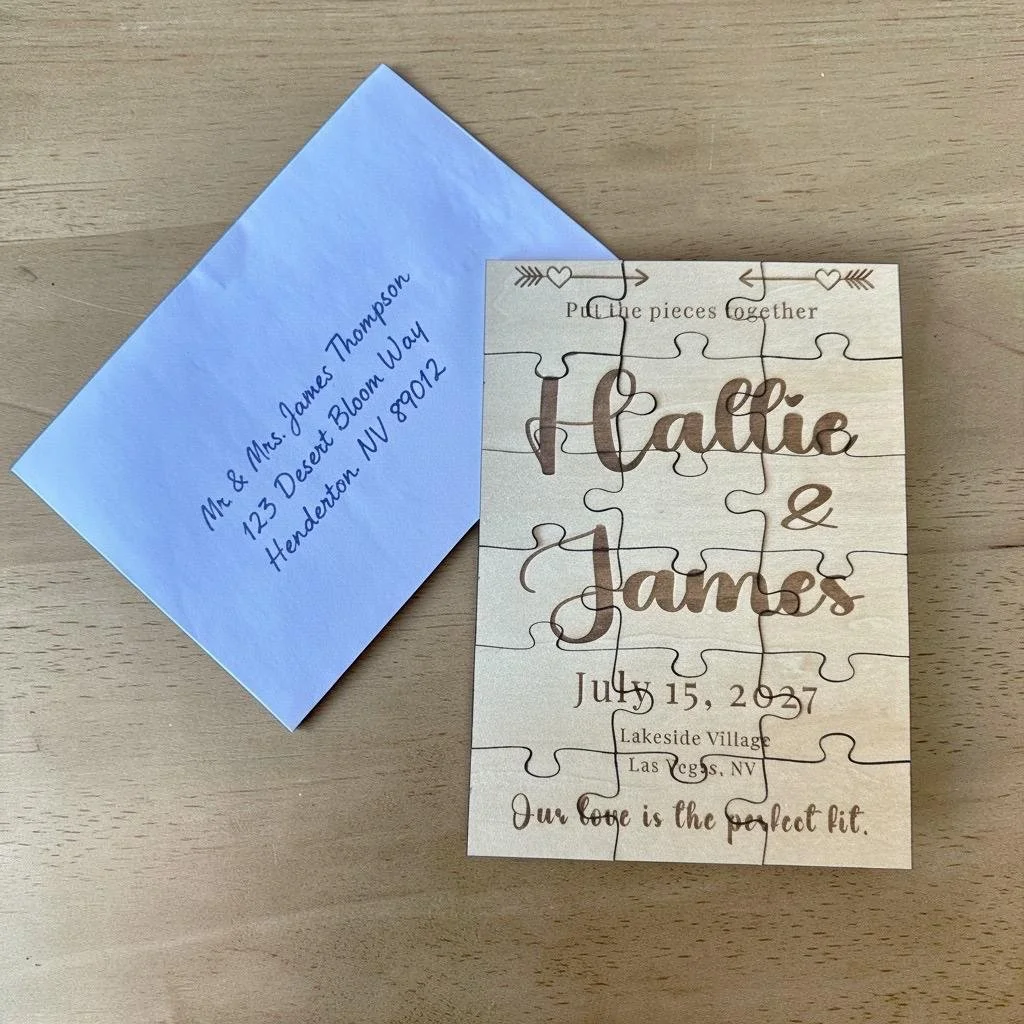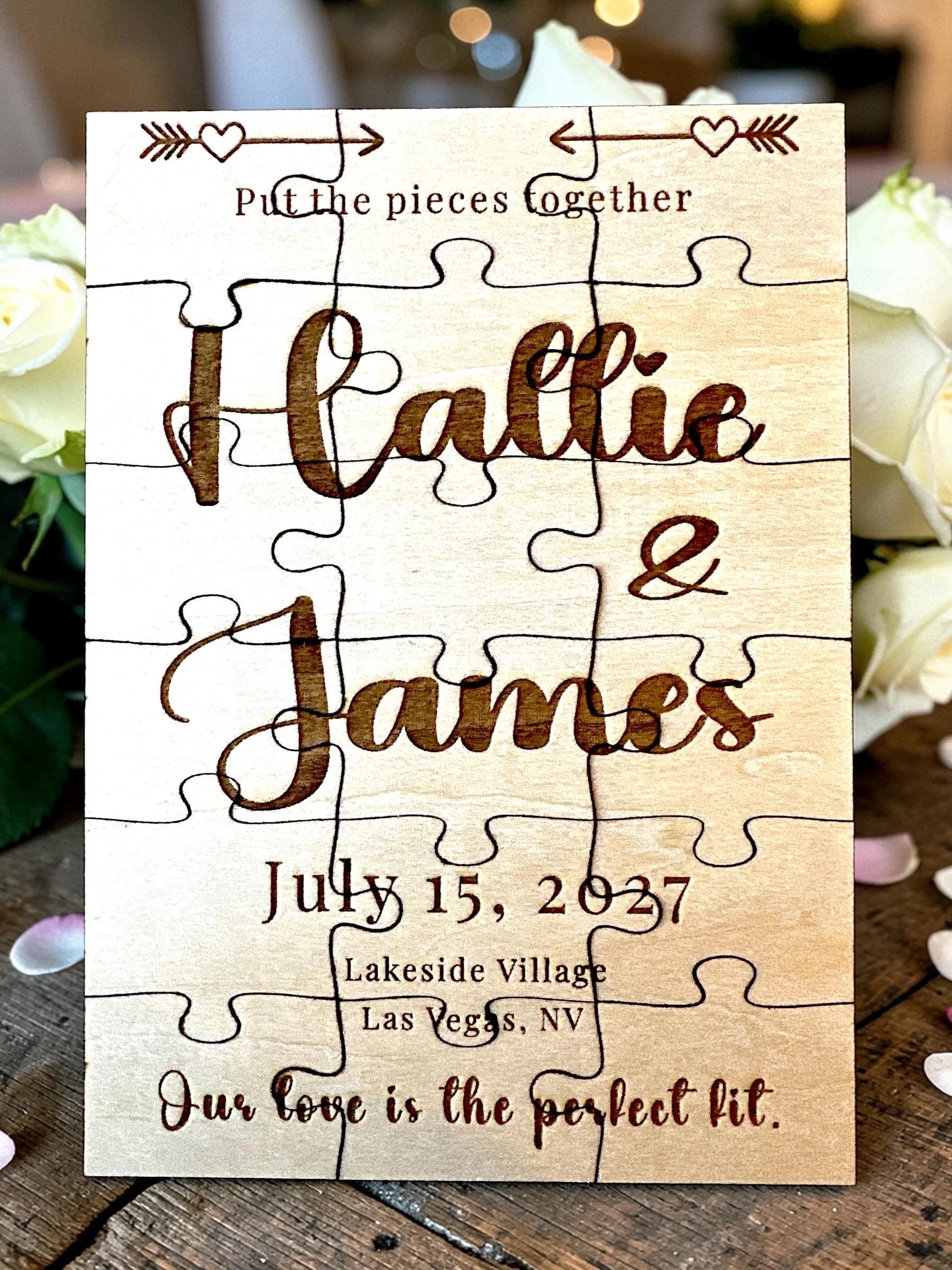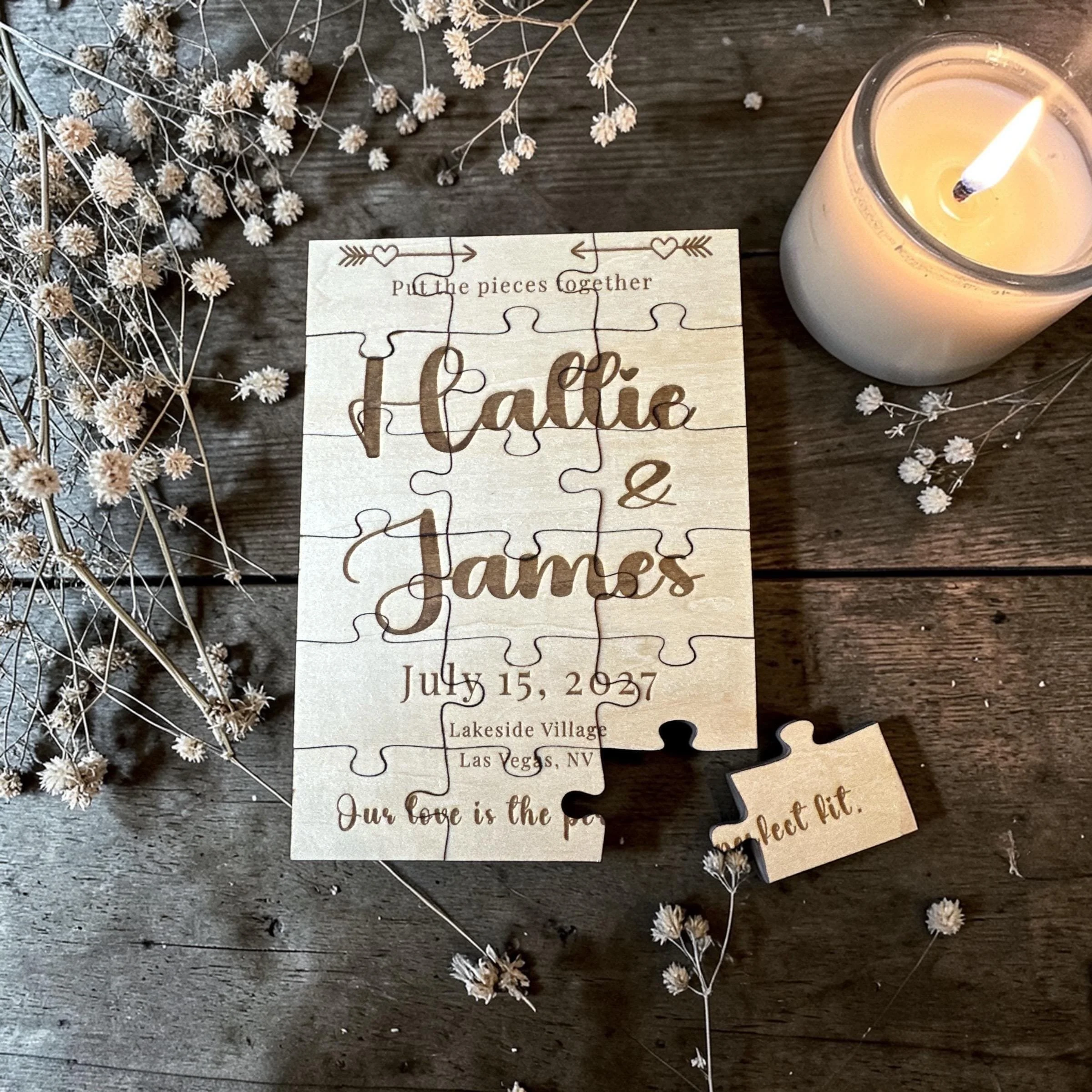 Tell your love story in a beautiful, meaningful way with this personalized wooden piece, cut into puzzle pieces. This puzzle gets put together to invite your guest to your wedding. Large font name takes the space for the puzzle. Perfect for romantic, rustic or modern weddings, this wooden card adds a heartfelt touch to your wedding stationery.